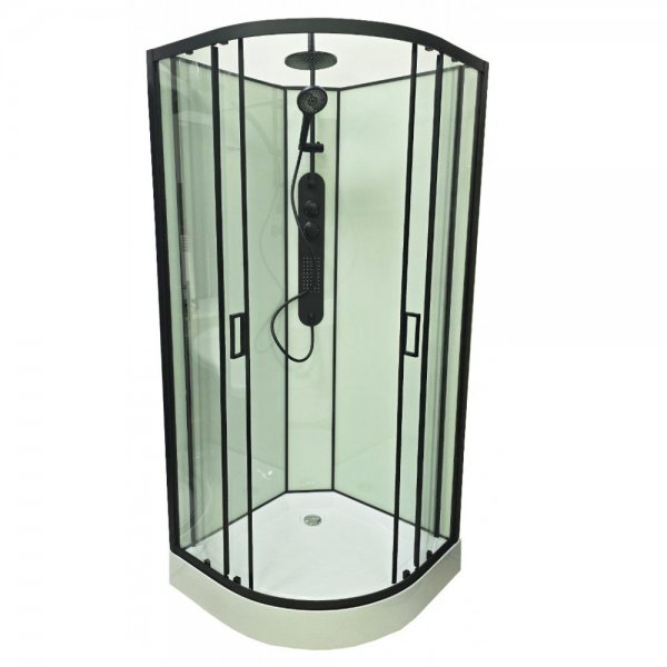 Комплектація: піддон, розсувні двері, бічні передні і задні стінки, гідромасажна панель з пультом керування Bluetooth, ручний душ, металеві ручки, поличка, чорний профіль, тропічний душ