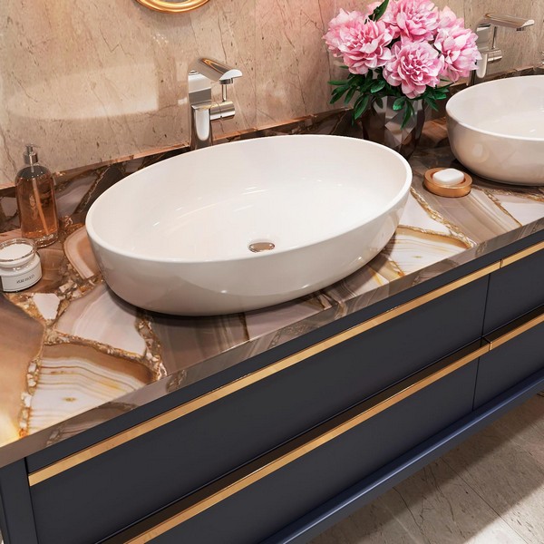 Стільницю і умивальник Ви можете підібрати в одному кольорі, що створить ідеально завершений дизайн Вашої ванній кімнаті, вони будуть гармоніювати і доповнювати один одного, виглядати стильно і дорого. Так само Ви можете замовити стільницю і умивальник в різних кольорах: абсолютно протилежних або ж в одній колірній гамі, але з різними ефектами, який перетворить Вашу ванну кімнату, додасть їй шарм і чарівність, зробить її яскравою і ексклюзивною.